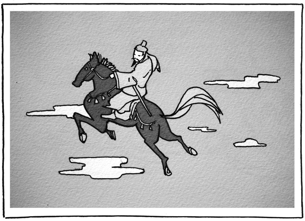 愛馬の黒駒とともに富士山の頂上に駆け上がった