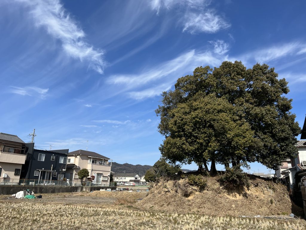 ・古墳はほとんど裾を削り取られ、水田化されているため、現状は径14mほどであるが、周辺で行われた発掘調査の結果、直径30m級の円墳と考えられている。